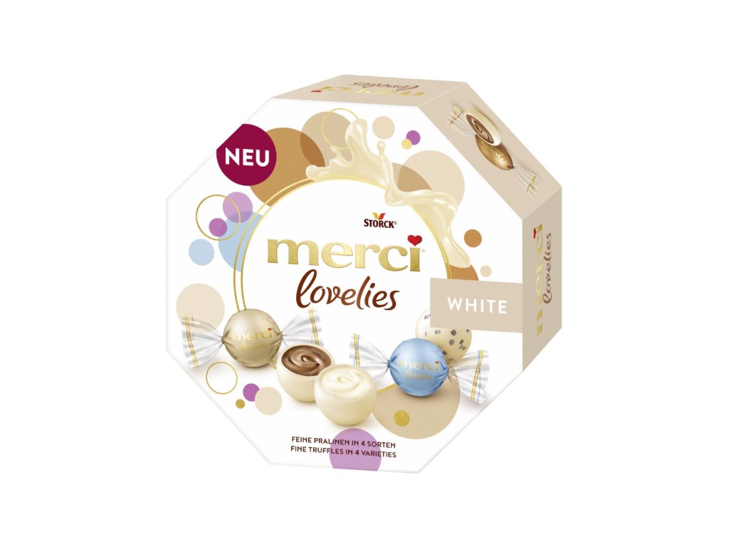 Skutočný sen v bielom! S lahodným Merci Lovelies White môžete urobiť radosť svojim blízkym. S polevou z bielej čokolády majú príjemne jemnú chuť. Chrumkavé guličky sa jemne rozplývajú na jazyku a rozvíjajú lahodnú vôňu ich náplní. Plný chuťový zážitok pre náročných maškrtníkov. Darčeková krabička so 14 jednotlivo balenými čokoládami v 4 príchutiach. Darčeková krabička má rozmery cca 15 x 15 x 5cm a obsahuje tieto druhy: cappuccino krém, biely krém, stracciatella a biela mandle.